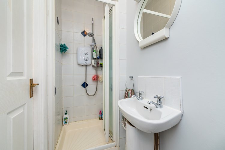 Tiled floor and surround, w.c , w.h.b and bath with shower attachment.