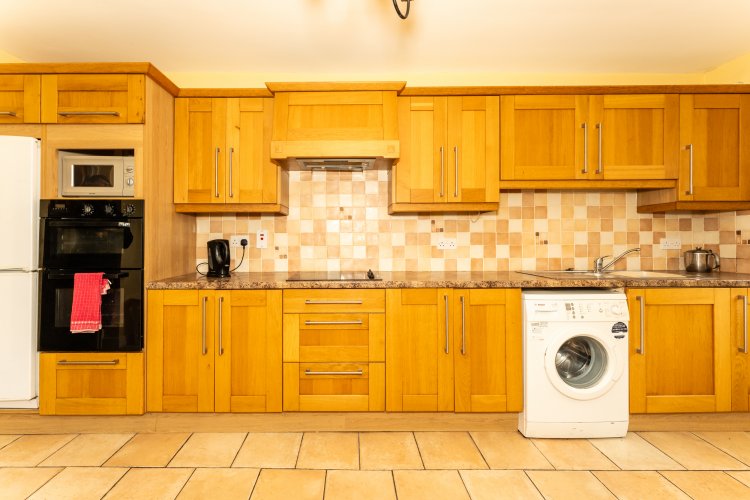fitted kitchen units, tiled splashback & flooring, integrated oven, hob & hood, fridge freezer, microwave