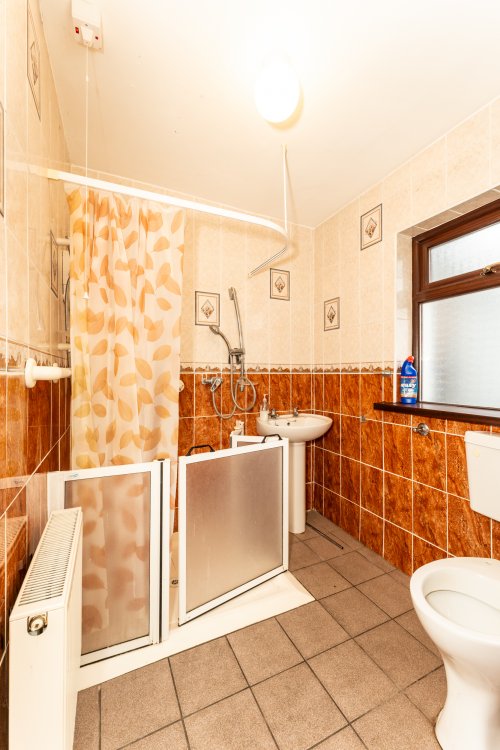 Bathroom Tiled bathroom, wheelchair accessible shower, toilet, WHB
