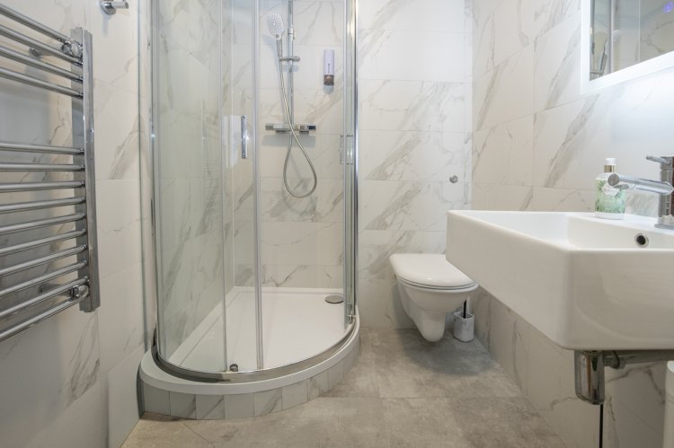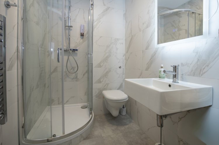 The main bedroom is tastefully decorated in calming light-grey tones with subtle black detailing, reflecting an excellent attention to detail. A large window allows natural light to flood the room, creating a bright and airy atmosphere. Laminate wood-effect flooring introduces warmth, while floor-to-ceiling cream wardrobes provide excellent storage. This bedroom further benefits from a recently renovated ensuite bathroom, finished with grey stone-effect floor tiles, white marble-style wall tiling, a shower suite and heated towel rail, adding a touch of luxury.