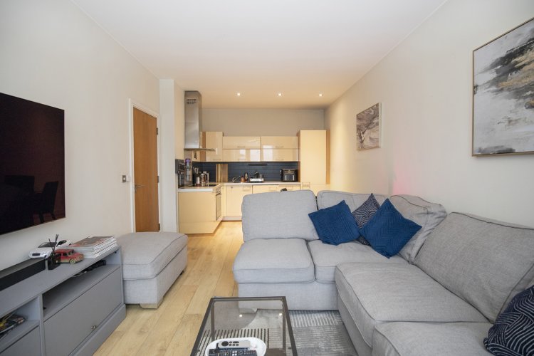 The heart of the home is the spacious open-plan kitchen, living and dining area, a beautifully light-filled space designed for both everyday living and entertaining. The continuation of the laminate flooring and neutral colour scheme creates a seamless flow, while the large floor-to-ceiling windows enhance the sense of space and provide direct access to a private east-facing balcony – the perfect spot to enjoy morning sunshine or summer evenings.