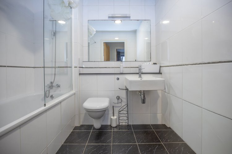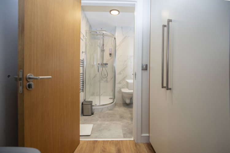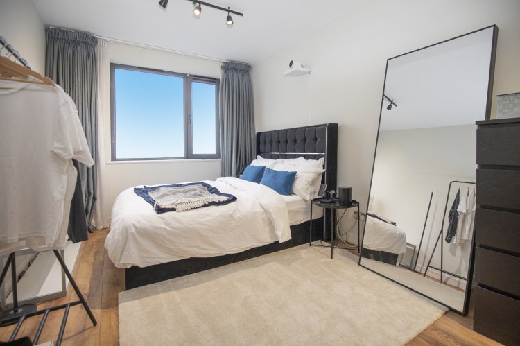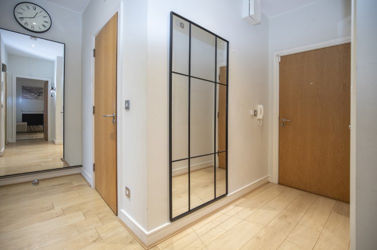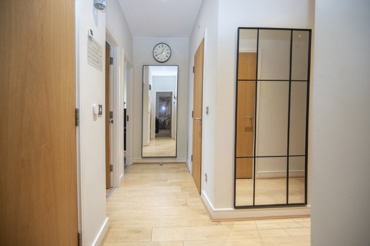 On entering the apartment, viewers are greeted by a wide, bright and welcoming entrance hallway, finished with laminate wood-effect flooring and a soft light-grey colour palette. Subtle black accents introduce a contemporary edge, setting the tone for the stylish accommodation that follows.