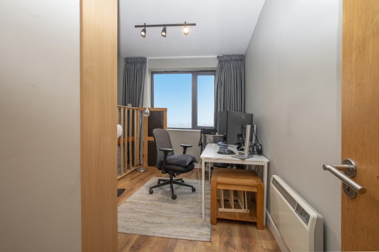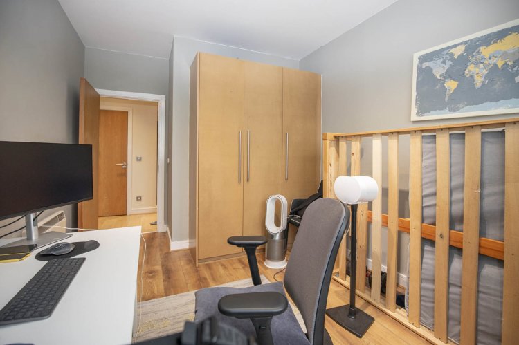 The second double bedroom, currently utilised as a home office, mirrors the same high standard of finish, with laminate flooring, neutral décor and a large window ensuring a bright and flexible space. Floor-to-ceiling wardrobes again provide ample storage, making this an ideal guest bedroom, home office or additional living space.