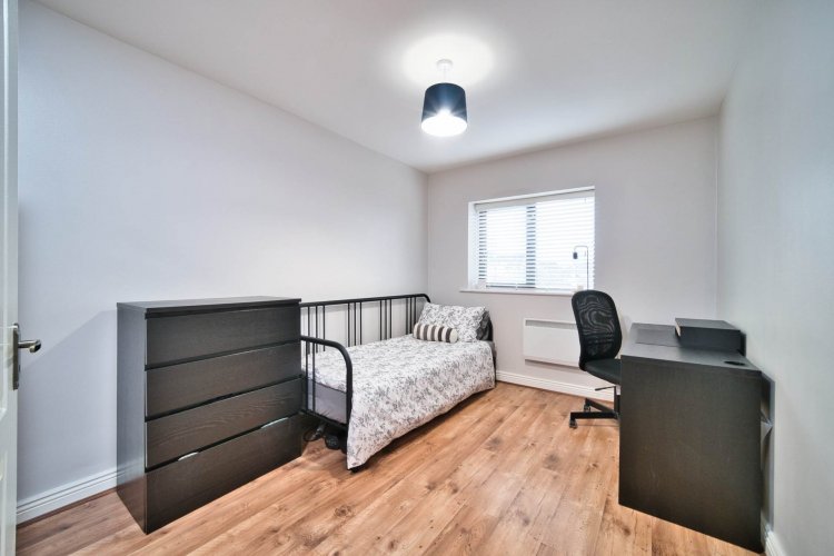 Bedroom 2 2.74m x 3.6m Laminate flooring, blinds and light shade.