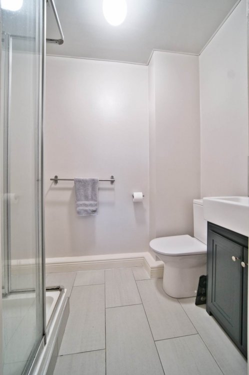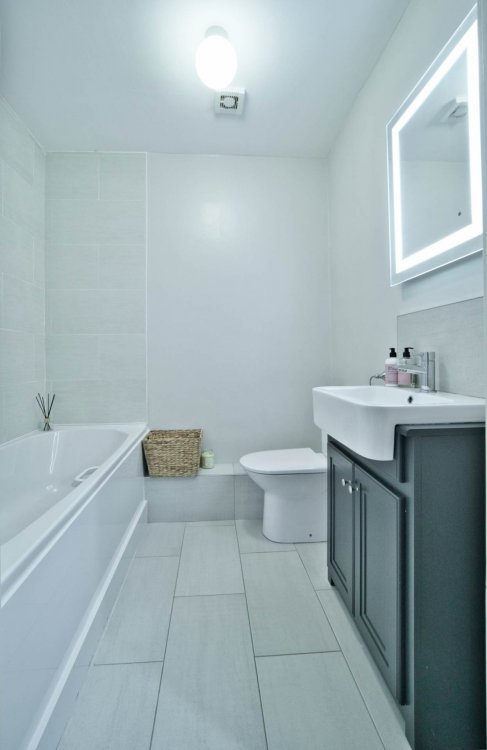 Bathroom 1.94m x 1.72m Tiled flooring, tiled around the bath with a shower screen and shower, w.c., w.h.b. with built in vanity unit, fitted mirror with light, extractor fan and light fitting.