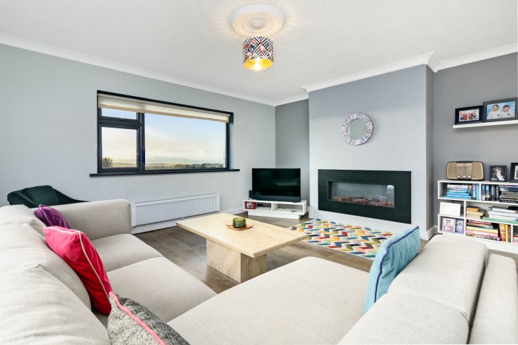 Lino wood flooring. Dual aspect windows offering ample natural light and scenic views. Coving to ceiling. Built in electric fireplace. |