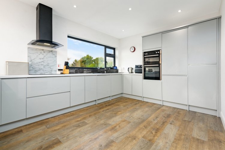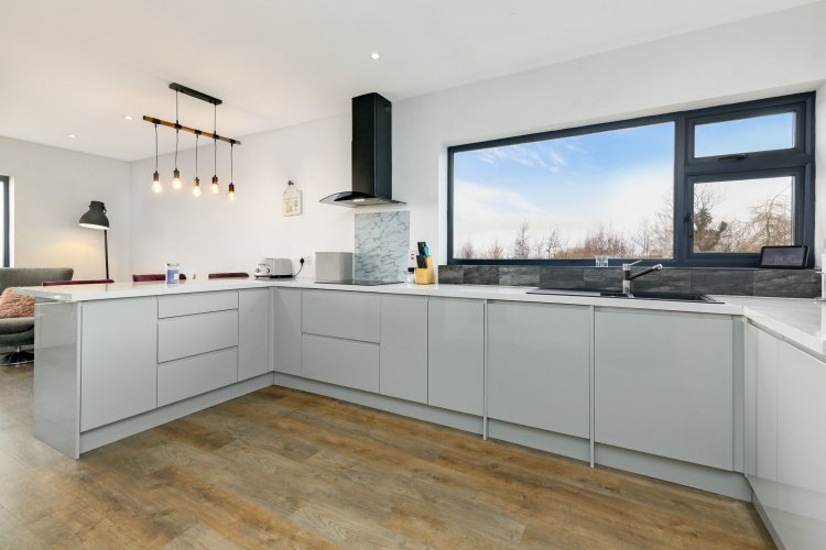 Lino wood flooring. Fully fitted kitchen with integrated appliances. Breakfast bar. Dual aspect windows with beautiful views. |