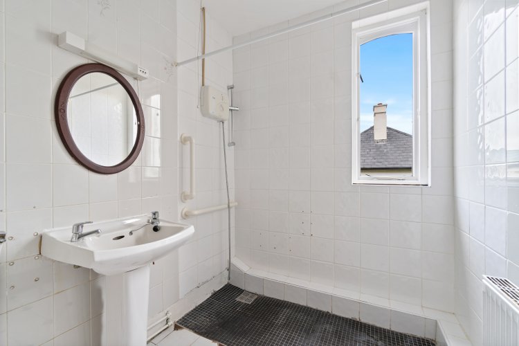 Fully tiled flooring, fully tiled walls, WC, WHB and shower which is finished in wet room style with electric shower fitted (shower in need of repair). |