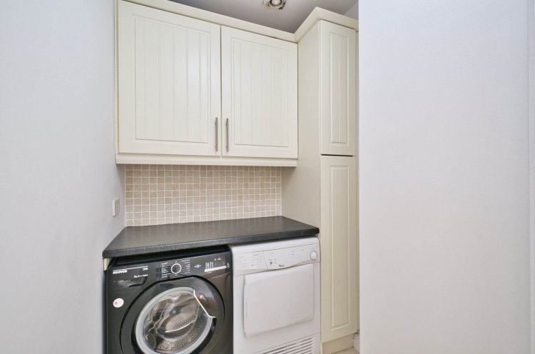Utility Room 1.56m x 1.65m Plumbed for washing machine and dryer, storage units, extractor fan and light fitting.