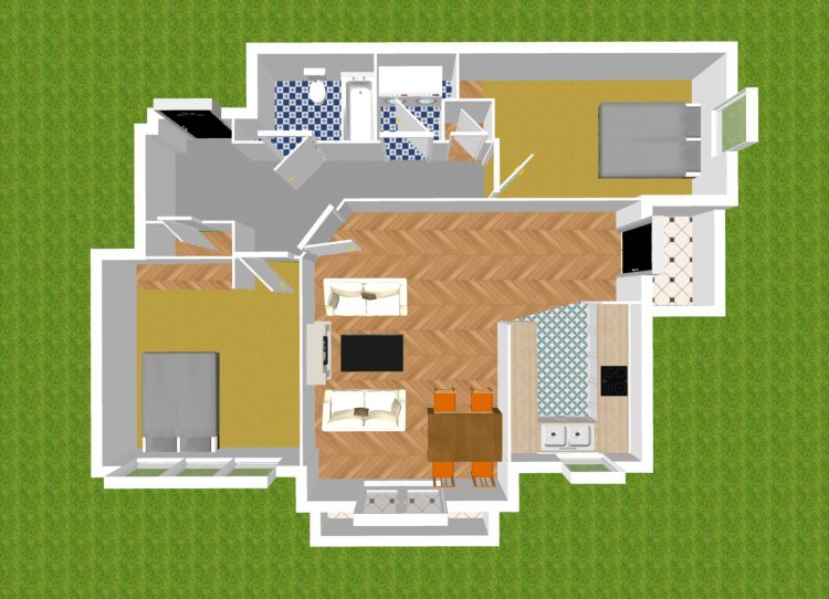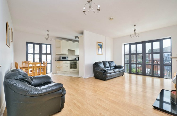 Kitchen/Dining/ Living Room (5.48m x 3.9m) + (2.49m 4.9m) Laminate & tiled flooring, shaker style wall and floor units, tiled splashback, oven, electric hob, extractor fan, fridge freezer, four light fittings, TV point, fireplace with electric fire insert, dual aspect, double French doors leading onto balcony and single door leading onto 2nd balcony.