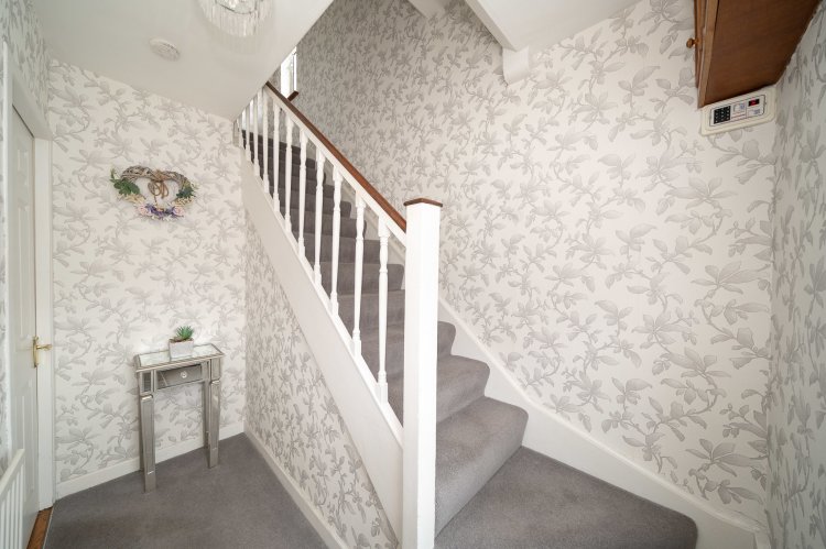 This beautiful home boasts an inviting driveway and an eye-catching red brick facade, complete with convenient side access. Upon entry, you are welcomed by a bright entrance hall finished with comfy carpet. To the left, the light-filled open-plan living room features semi-solid wood flooring, a cosy gas fireplace, and convenient understairs storage. Sliding doors lead through to the charming kitchen and dining area, which offers laminate flooring, generous countertop and cupboard space, and stylish splashback tiling. The dining area opens onto a sunny, south facing patio and garden an ideal setting to relax and entertain. Upstairs, there are two spacious double bedrooms, one of which enjoys views overlooking the canal. Both rooms feature built-in wardrobes and semi-solid flooring. Completing the property is a fully tiled bathroom with a walk-in shower and additional storage space.