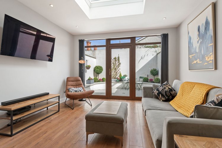Behind its welcoming façade lies a thoughtfully designed interior. Upon entering, you’re greeted by a bright entrance hallway with a guest w.c., leading through to a spacious open-plan kitchen and dining area. The kitchen is fitted with an array of floor and overhead units, complemented by a classic subway tile backsplash. To the rear, a cosy and light-filled living area opens directly onto a private, patioed garden – perfect for al fresco dining – a peaceful retreat in the heart of the city.