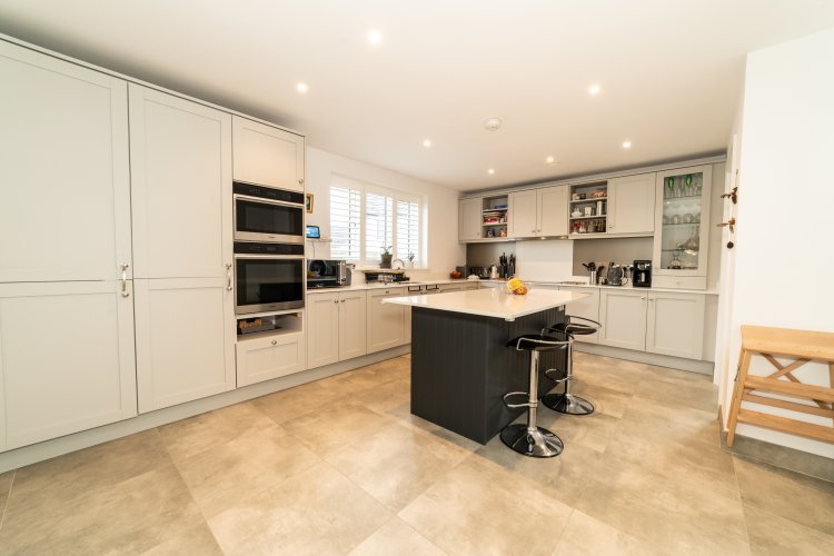 Kitchen Tiled flooring, quartz worktop, quartz/stainless stell splashback, fitted kitchen units, integrated double oven, induction hob, hood, integrated fridge and freezer, integrated dishwasher, island