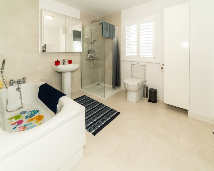 Main bathroom Tiled flooring and bath enclosure, bath, whb, toilet, low profile shower tray, pump shower, built in storage, heated towel rail