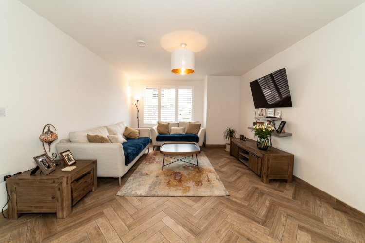 Wood effect tiled flooring, tv point, double doors onto Dining room