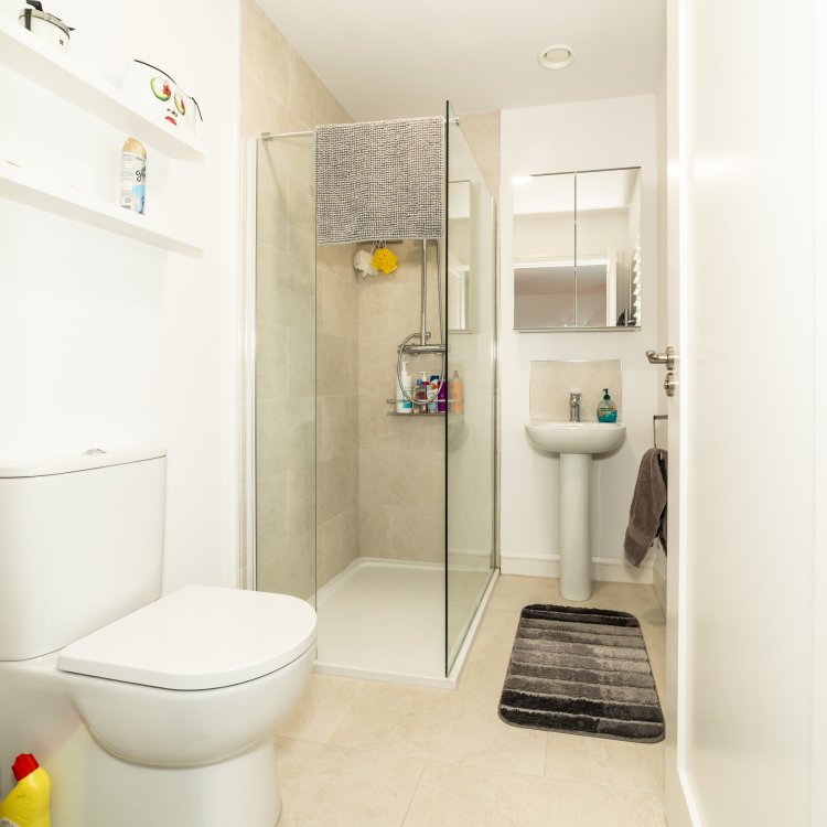 En-suite tiled flooring and shower enclosure, low profile shower tray, pump shower, whb, toilet, heated towel rail