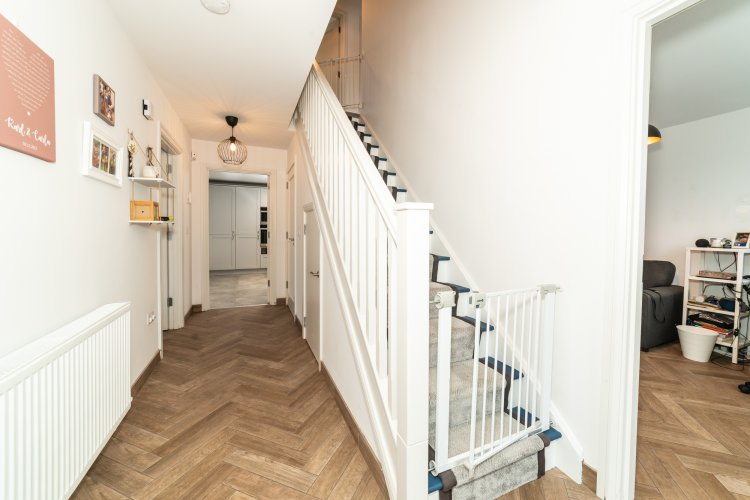 Wood effect tiled flooring, carpet runner to stairwell