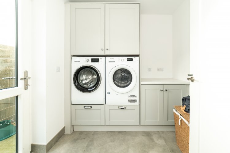 Utility Tiled flooring, quartz worktop, Whirlpool washing machine, Whirlpool Dryer, fitted units, quartz worktop, side access