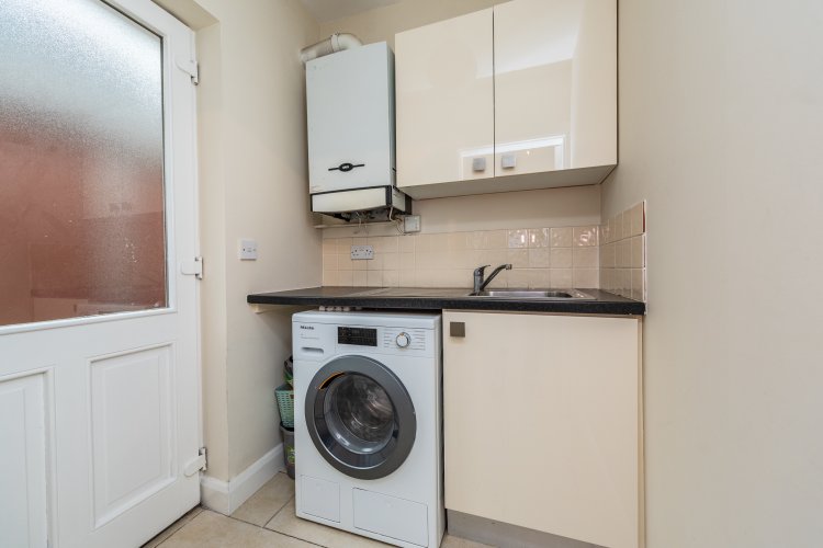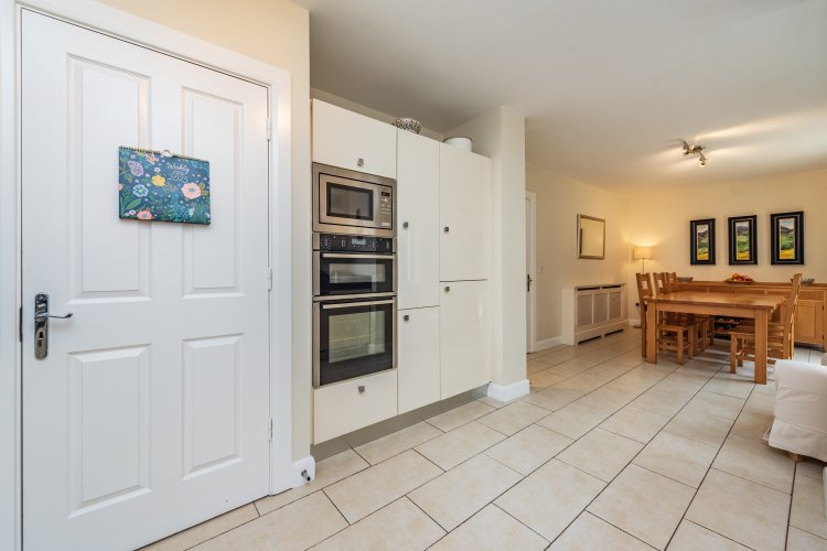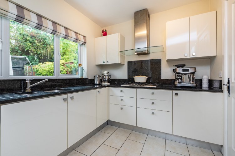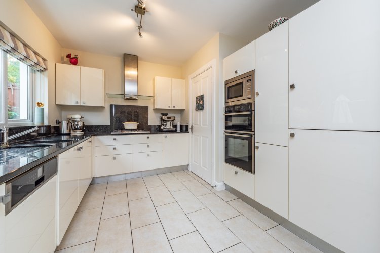 With high gloss built in ground and eye level presses, granite worktops/splashback, 5 ring Neff gas hob, Neff double oven, extractor, Neff microwave, integrated fridge/freezer, Neff integrated dishwasher, tiled floor and patio doors leading to rear garden. |
