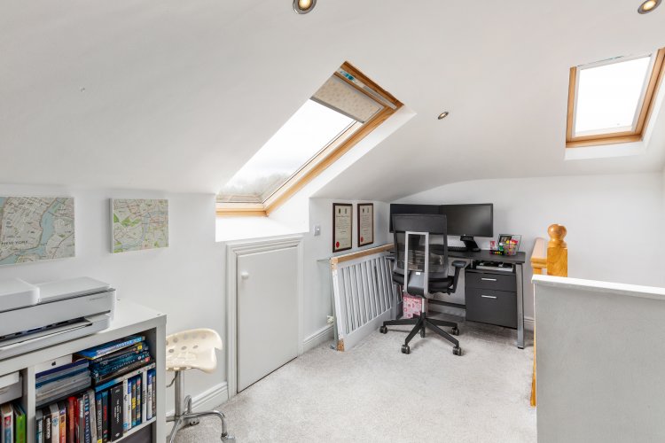 Attic Room: 4.15m x 2.40m with carpet floor, feature Velux windows with main larger Velux window giving view to front aspect and feature recessed lighting