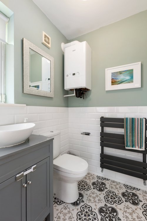 Guest WC: 1.54m x 1.40m comprising wc and designer wash hand basin over wooden unit, tiled floor and subway tile design on walls, boiler fitted, window to front