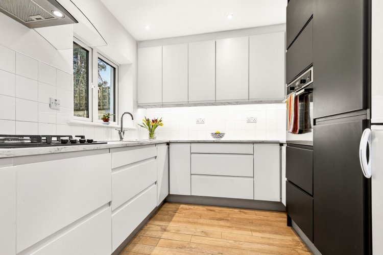 Fully fitted kitchen. Laminate wood flooring. Tiled splash-back.