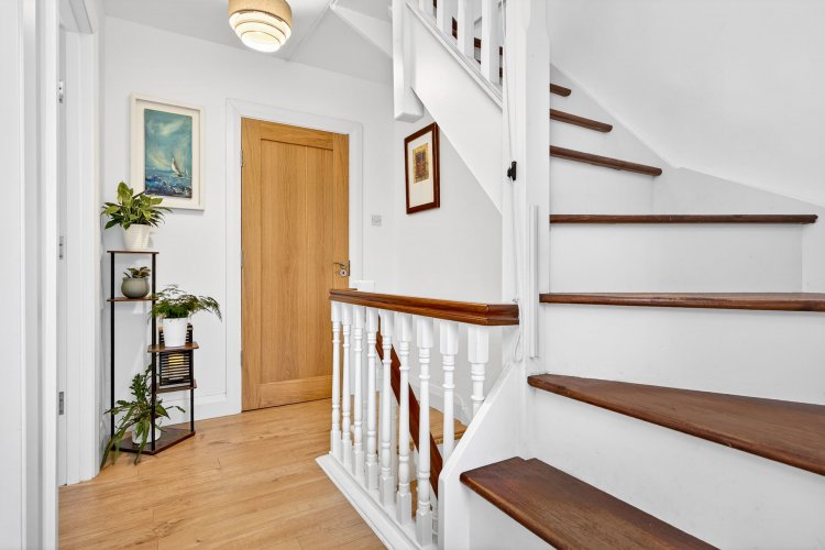 Wooden Staircase. Understairs storage. Tiled Flooring.