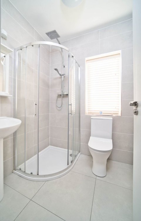 Bathroom 2.68m x 1.68m Fully tiled, bath, separate shower cubicle, w.c., w.h.b., fitted mirror with shaving light, venetian blinds, extractor fan aand light fittng.