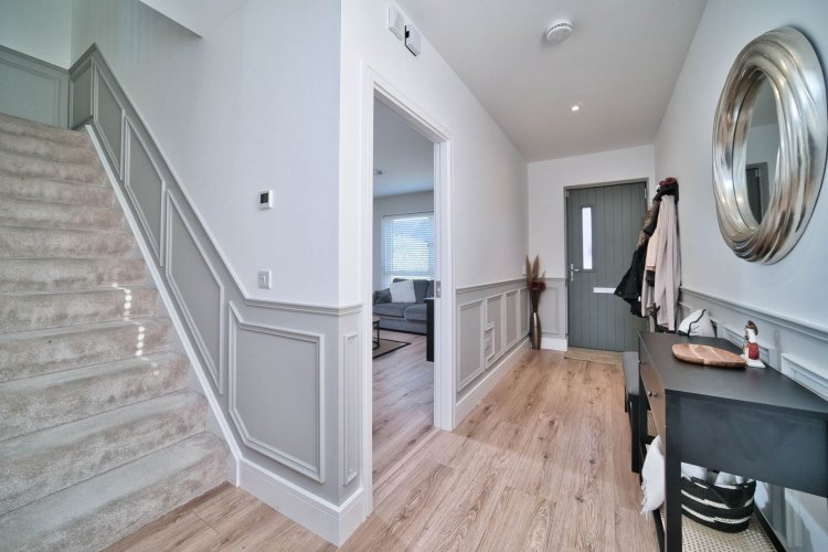 Entrance Hallway 6.5m x 1.48m Laminate floor, radiator cover, alarm panel, wood panelled wall and recessed lights.