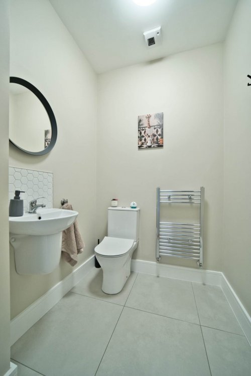 Guest W.C. 1.52m x 1.58m Tiled floor, w.c., w.h.b., extractor fan, vertical heated towel rail and light fitting.