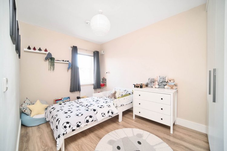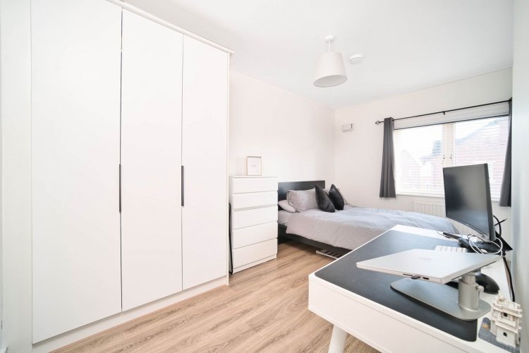 Bedroom 4 3.35m x 2.55m Fitted wardrobe, laminate flooring, curtains and venetian blackout blinds.