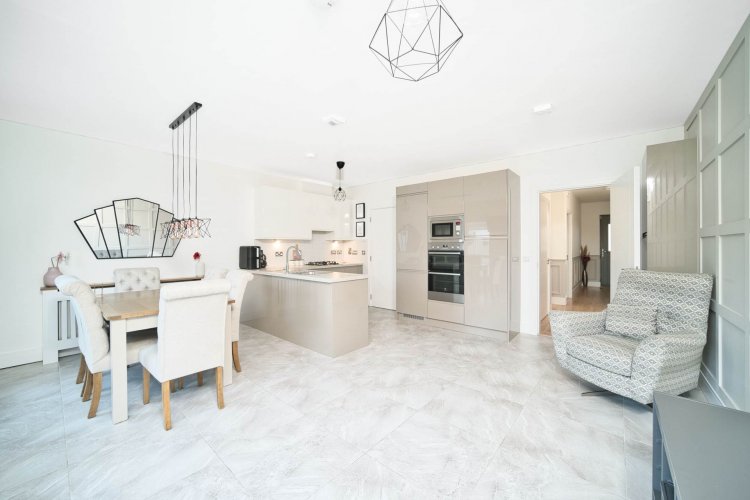 Kitchen/Dining 5.38m x 5.46m Tiled floor, fitted wall and floor units, quartz worktop, double oven, gas hob, fitted microwave, extractor fan, dishwasher, tiled splashback, half panelled wall, venetian blinds and French doors leading to rear garden.