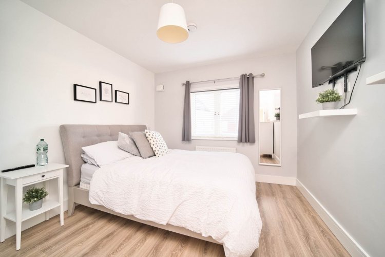Bedroom 2 4.6m x 2.22m Facing back garden Laminate flooring, curtains, venetian blackout blinds and half panelled feature wall.