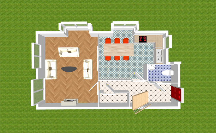 Kitchen/Dining 5.29m x 4.27m Fitted wall and floor units, tiled floor, 2 light shades, bay window, venetian blind, oven, gas hob, extractor fan, dishwasher and double French doors into living room.