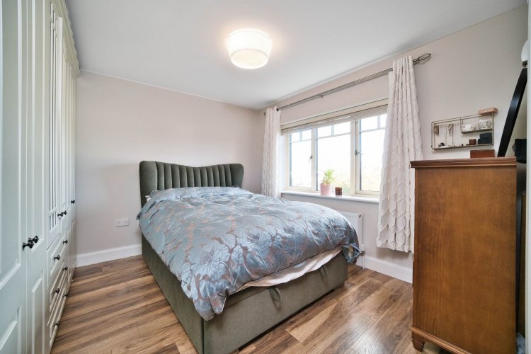 Bedroom 3 2.78m x 2.13m Wood flooring, fitted wardrobes, light shade, and blinds.