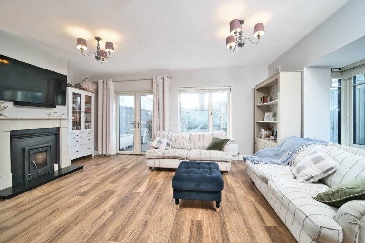 Living Room 3.8m x 6.25m Wood floors, feature fireplace with solid fuel stove, venetian blinds, light fitting, tv point and double French doors leading into rear garden.