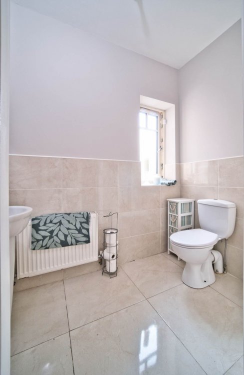 Guest W.C. 1.28m x 2.15m Tiled floor, w.c., w.h.b., half tiled wall, fitted mirror, shaving light and light fitting.