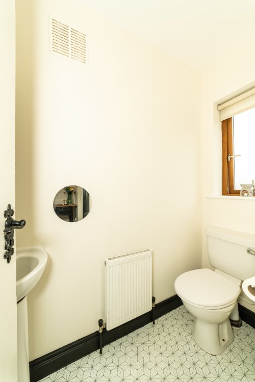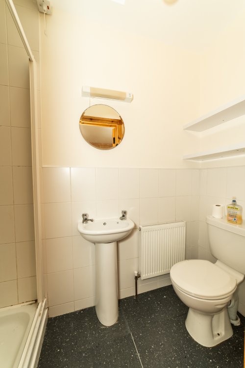 Downstairs bathroom Tiled flooring and shower enclosure, pump shower, WHB and toilet