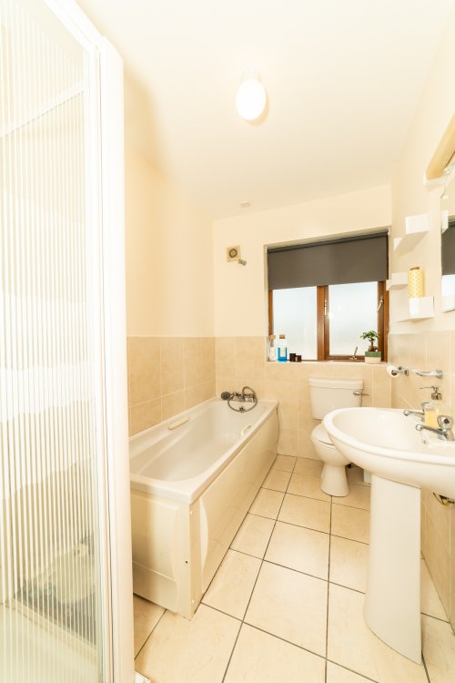 Main bathroom Tiled throughout, bath, shower, toilet and whb