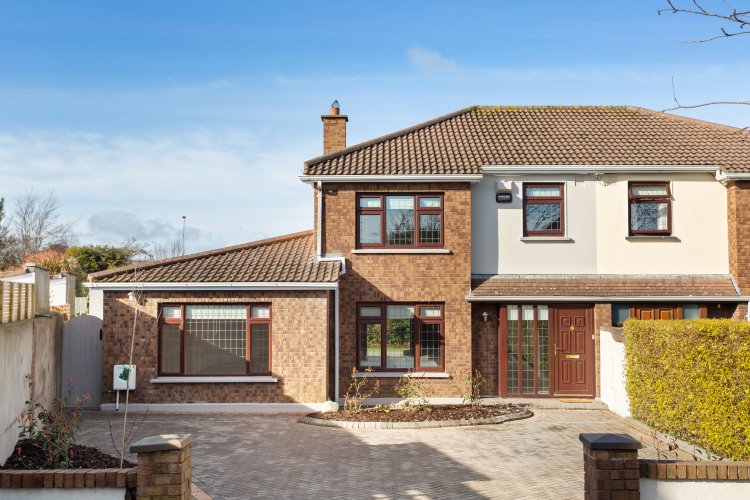 An absolutely immaculate modern semi detached four bedroom family home (approx. 180 Sq.M / 1,940 Sq.Ft) which includes an extension to side of 630 Sq.Ft set out on a large corner site with a garage of 96 Sq.Ft and is all presented in pristine condition throughout which is ready to walk into and is superbly positioned in a prime cul de sac location within this upmarket family development. There is a cobble locked driveway to front and a very large well maintained, mature landscaped rear garden which is further complimented by a south westerly facing aspect and which has a sun trap sun sandstone patio and block built garden shed to the side.