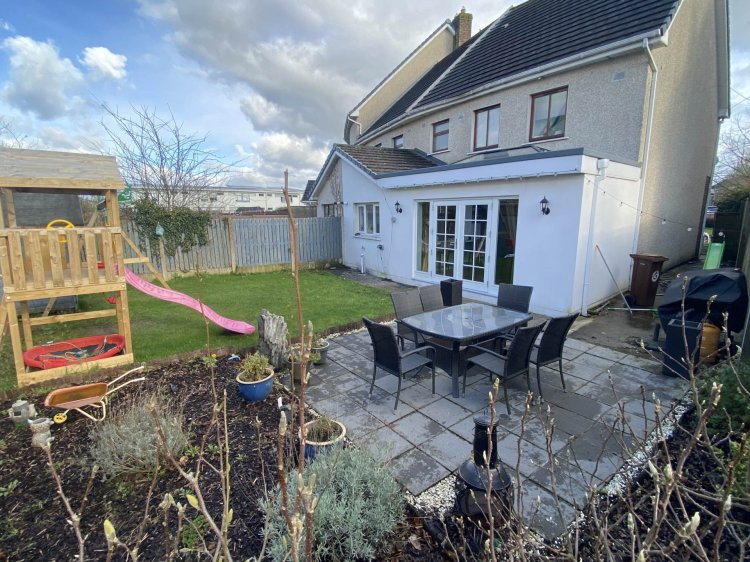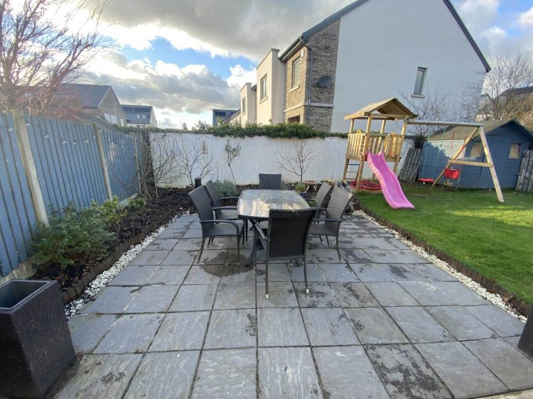 Garden (10.8m x 8.1m) + (2.3m x 12.8m) Patio area with granite slabs, lawn area, wooden shed, outdoor lighting, outdoor sockets, tap and side entrance with wooden gate.