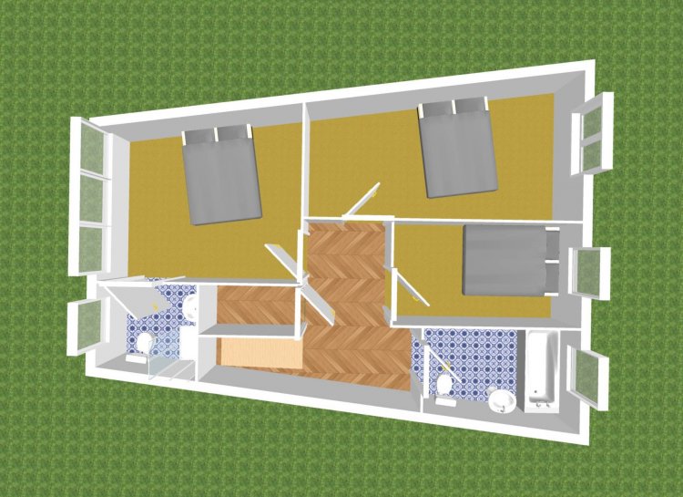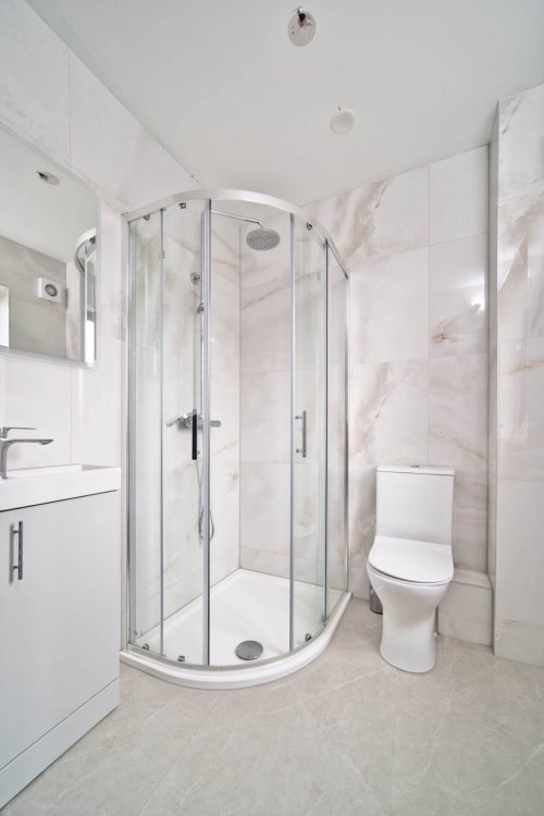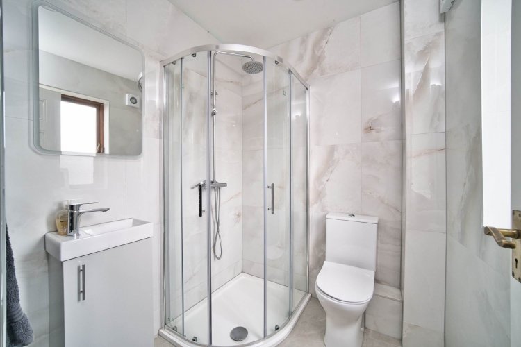 Family Bathroom 2.9m x 1.7m Fully tiled bathroom, recessed lights, w.c., w.h.b., window, vertical heated towel rail, bath with monsoon shower head and shower screen.