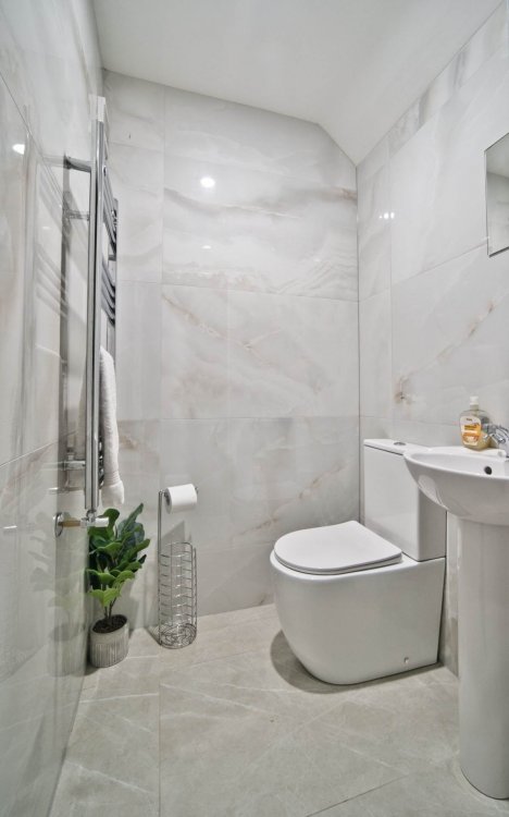 Guest W.C. 1.4m x 1.2m Fully tiled bathroom, recessed lights, w.c., w.h.b., fitted mirror, extractor fan and vertical heated towel rail.