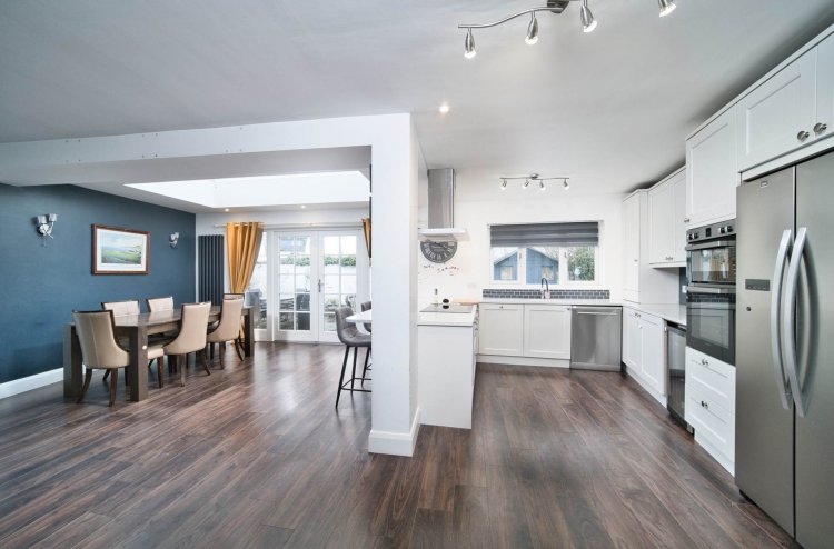 Living/Kitchen/ Dining Area 2.5m x 3.6m, 5.2m x 7.5m Laminate flooring, hanging pendant lights with shade, wall lights, recessed lights in kitchen and dining area, double French doors leading to rear garden, natural light opening in roof, fitted roller blinds and curtains, shaker style kitchen cabinets, double oven, hob, extractor fan and integrated dishwasher.