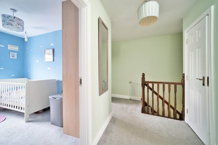 Landing (Including Hot Press) 4m x 3.4m Carpet from stairway to landing, hanging pendant light with shade, fitted smoke detector, access to attic space and fitted shelves in hot press.
