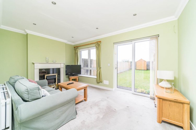 Living Room 2.82m x 4.56m Carpet, fireplace with electric fire insert, coving, recessed lights, sliding door leading to rear garden, curtains and blinds.