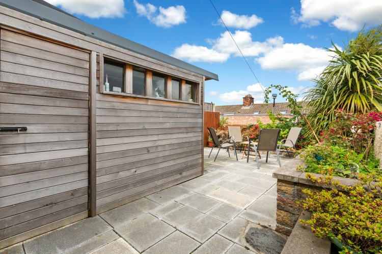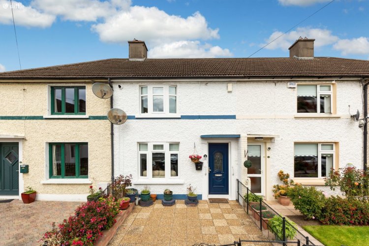 This charming property features a private parking on a paved driveway leading to an attractive facade. The entrance hall opens to a south facing living room with comfy carpet, a gas fireplace, understairs storage and wall lighting. A stained glass panelled door leads to the open plan kitchen and dining area with splashback tiling, built in shelves and plenty of counter & cupboard space. A rear tiled hallway provides has a pantry and provides access to a generous sized fully tiled bathroom with an electric shower and undersink storage. The sunny garden enjoys steps from the home to a paved area with beautiful flower beds and an amazing view of Kilmainham Gaol making it the ideal place to relax and entertain. There is also a spacious storage shed. Upstairs consists of three bedrooms with carpet, the main bedroom to the front of the home has fitted wardrobes. The attic is accessed via the landing.