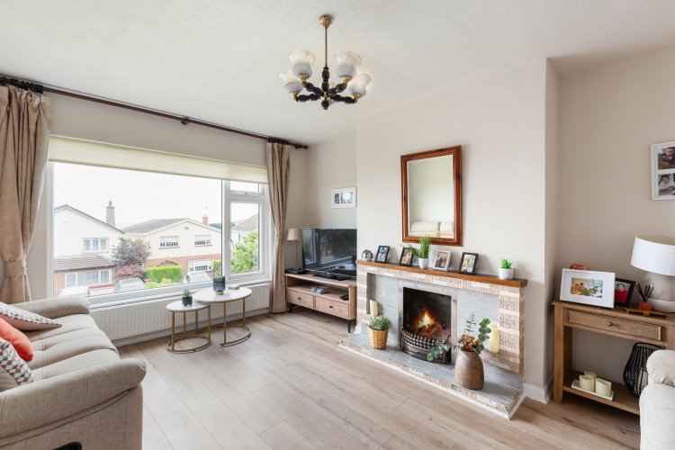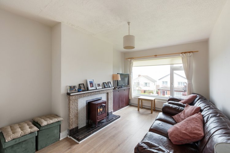 The internal layout is practical and well proportioned. A wide entrance hall leads to two reception rooms to the front, one a formal living room with fireplace and the other suitable as a second lounge home office or playroom. The kitchen and dining area is positioned to the rear with direct access to the garden. A guest WC, shower room, hot press and built in storage complete the hall layout.