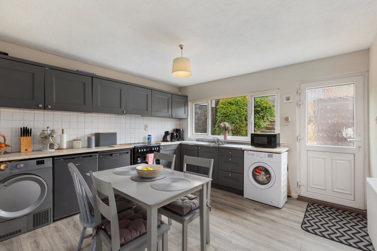 To the rear the garden is tiered with a paved patio area off the kitchen ideal for outdoor dining or relaxing. Steps lead up to a raised lawn which offers excellent privacy and potential to landscape or enhance. To the front the house is elevated from the street with steps leading to the main entrance and a lawn on either side. There is ample room to extend the house to the rear, subject to planning permission.