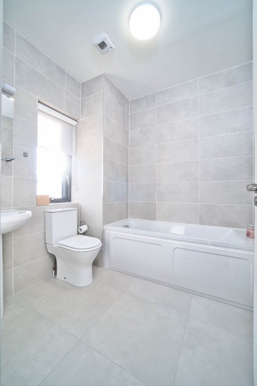 Main Bathroom 3.1m x 2.1m Fully tiled, light fitting, w.c., w.h.b., bathtub, separate shower cubical, fitted mirror with shaving light and toiletries shelf, blinds, extractor fan and vertical heated towel rail.